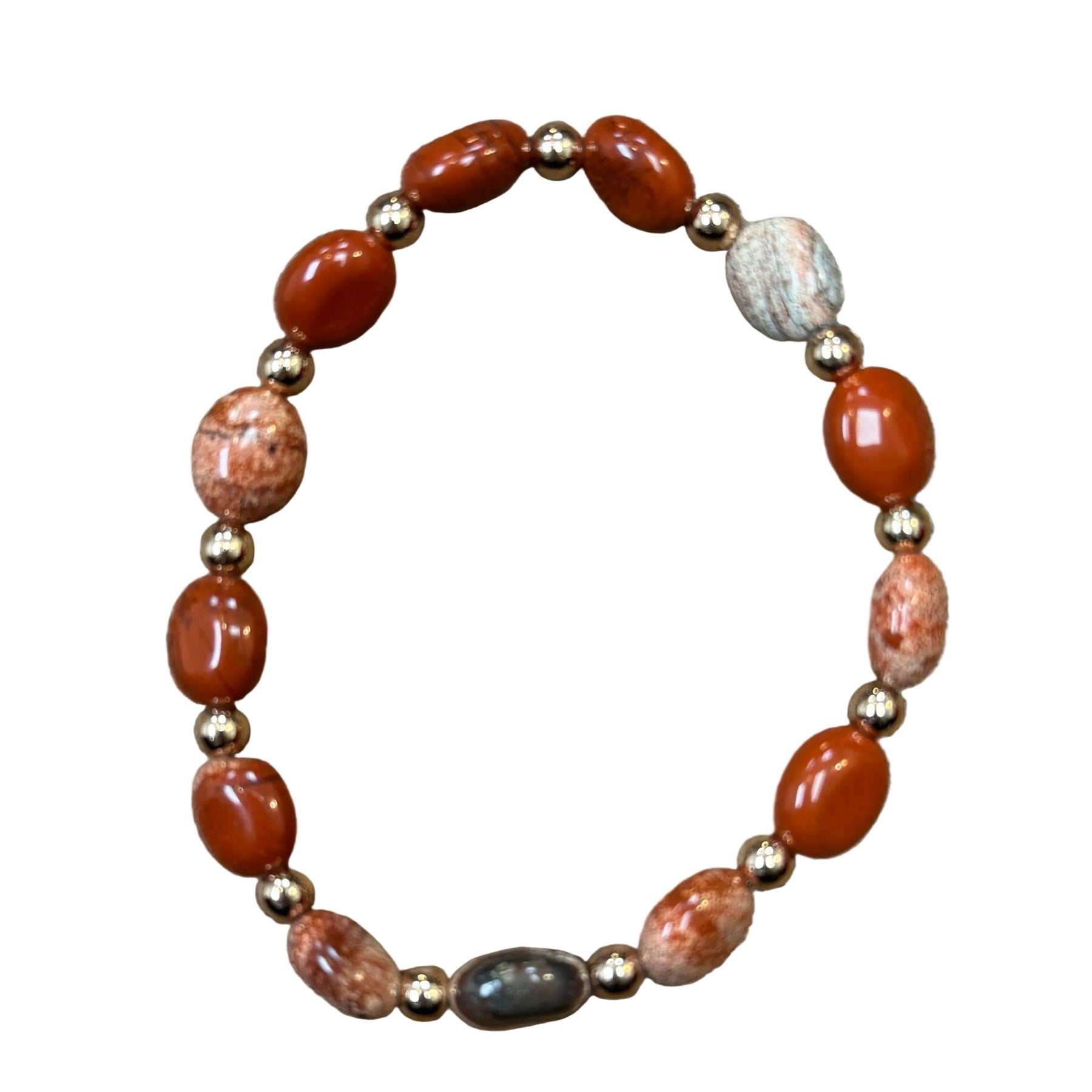 Enhance your look with the Red Jasper Oval Gold Ainsley Bracelet. Featuring puffy oval red jasper beads alternating with gold beads, this bracelet offers a perfect blend of earthy warmth and sophisticated shine.