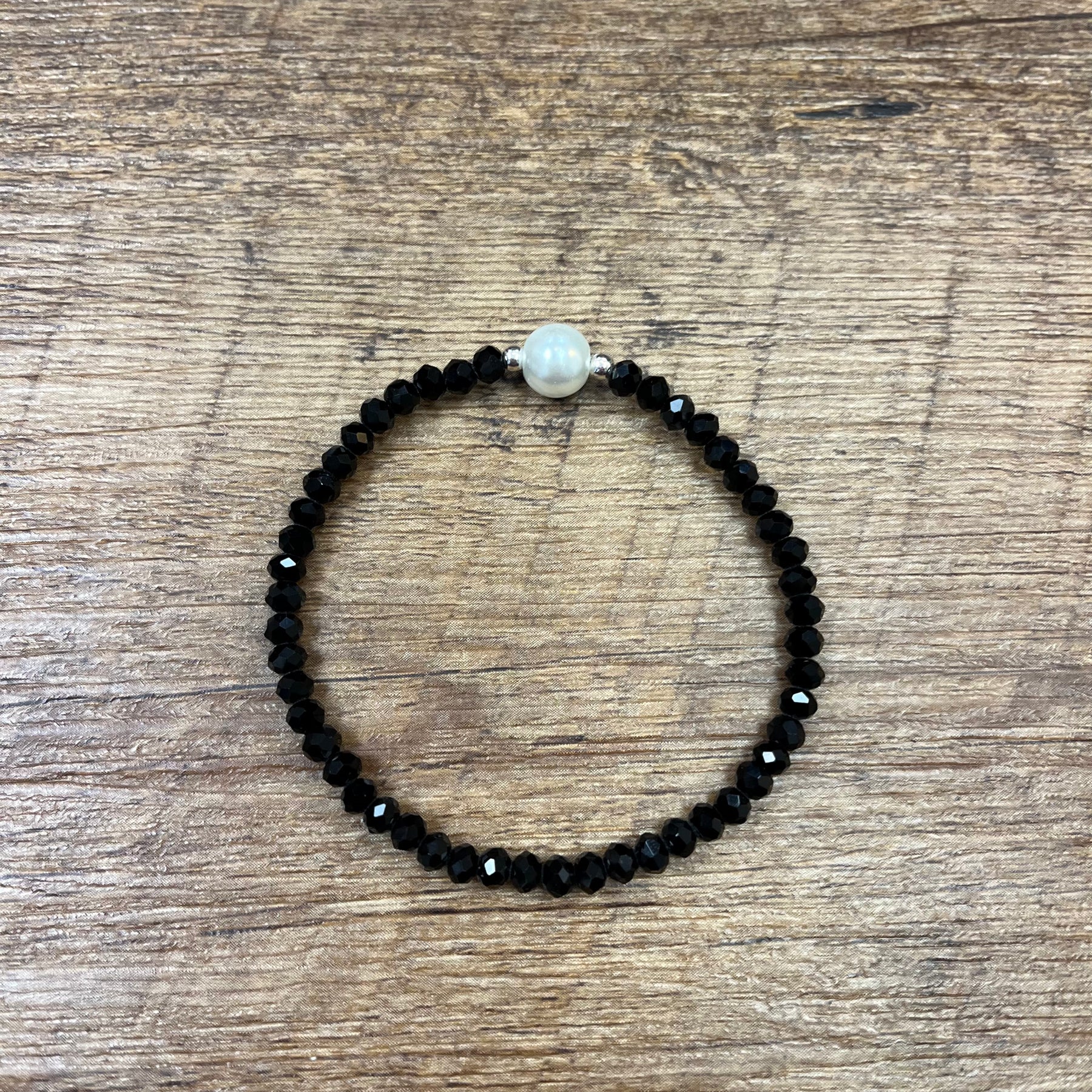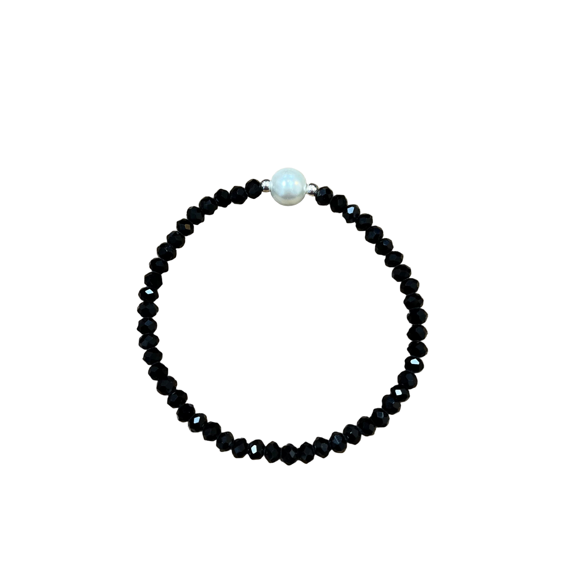 Introducing our Paige Pearl Sterling Silver Black Faceted Rondelle Bracelet, a dainty and elegant addition to your jewelry collection. The perfect pop of color, featuring a lustrous pearl and a striking, faceted black rondelles, accented with sterling silver beads.