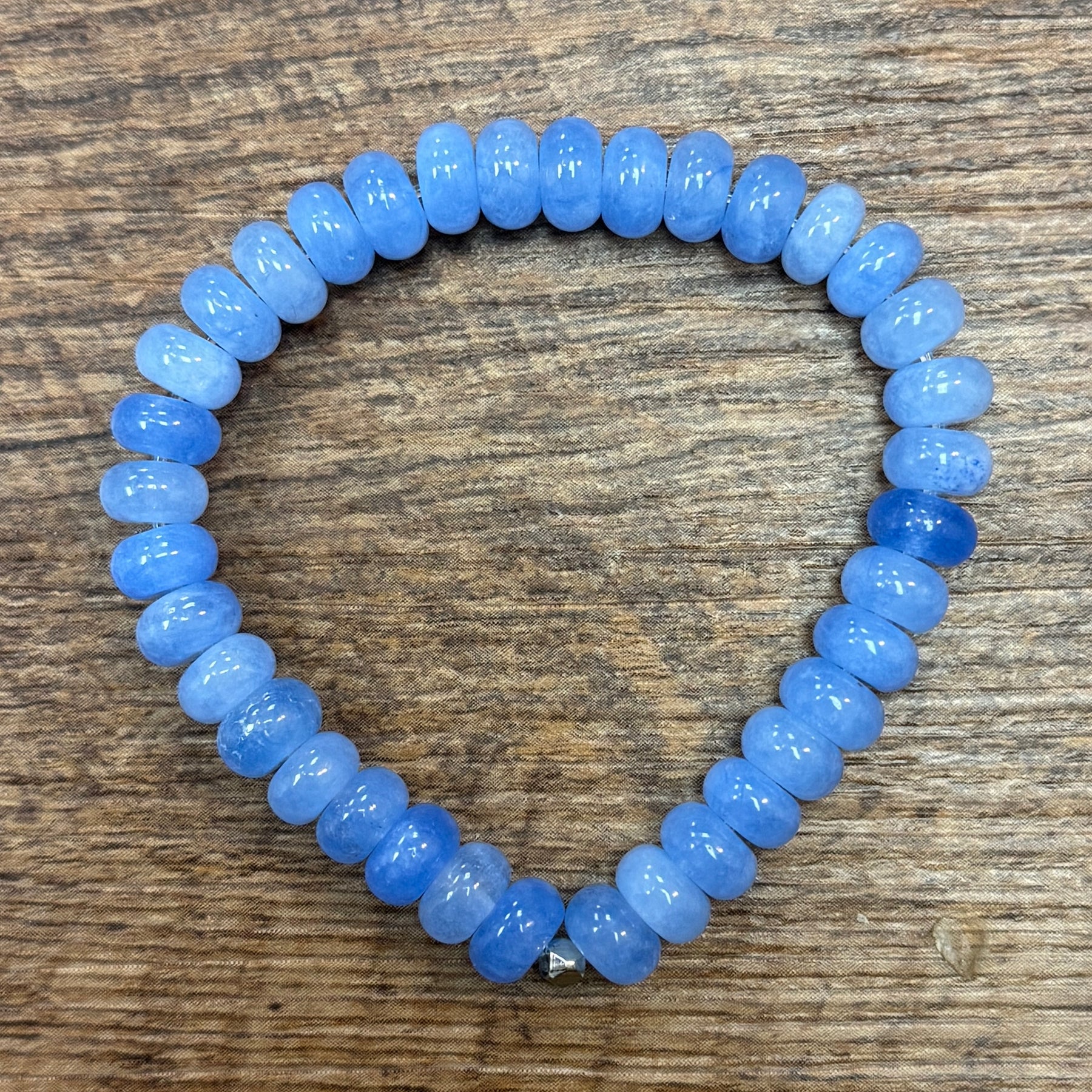 This Blue Angelite Smooth Rondelle Bracelet is perfect for adding some fun and spring-y vibes to any outfit. The smooth rondelle beads give it a playful touch, making it a must-have.