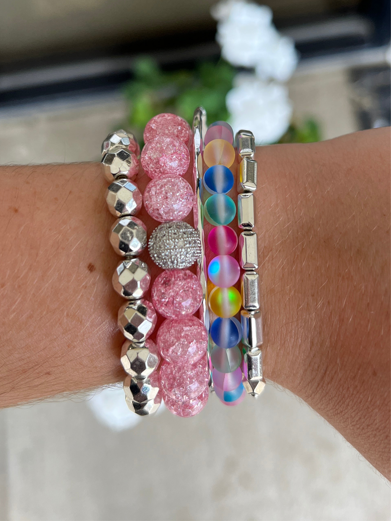 This beautiful Silver Pave Pink Crackle Glass 10mm bead is sure to give your stack a pop of color! Its elegant pink glass design and sparkling silver pave accents will add stunning accents to this bead!